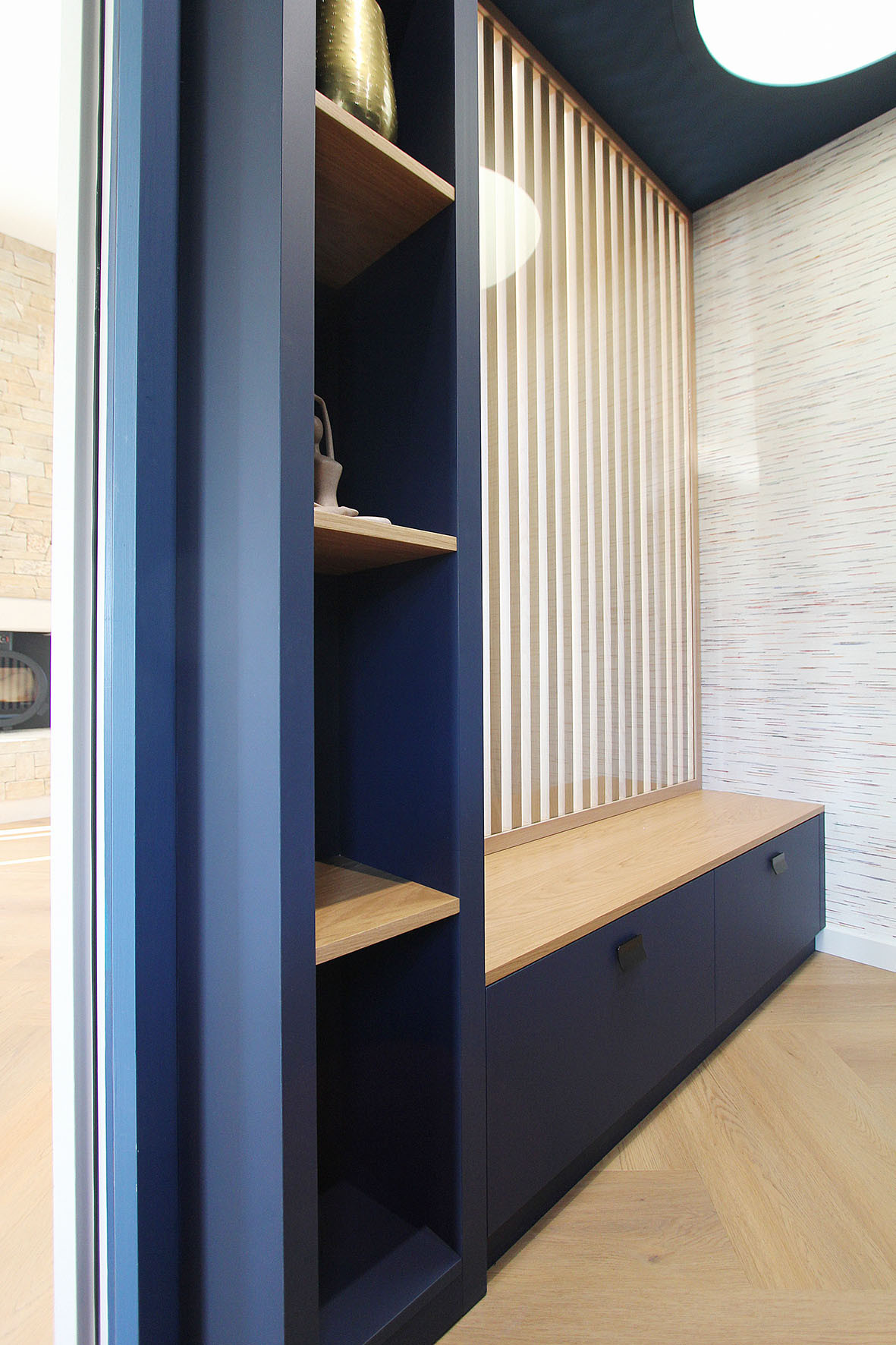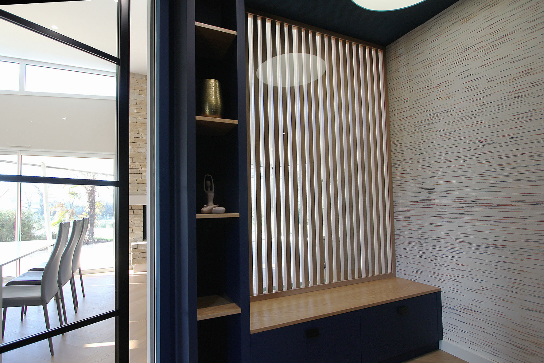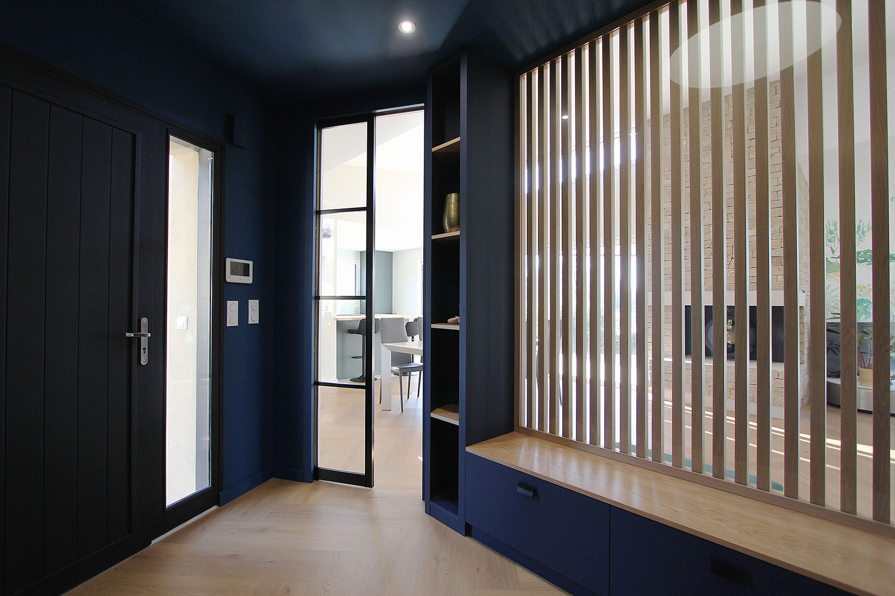 Une entrée optimisée grâce à des aménagements pratiques qui intègrent des rangements tout en créant une séparation avec le séjour.
